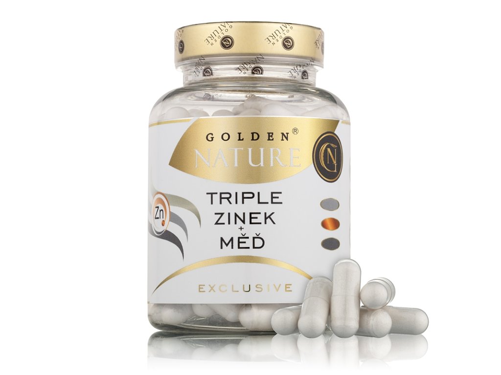 Zinok potrebujú naše kosti, nechty, vlasy, pokožka aj oči. Nepostrádateľný je pre zdravie reprodukčnej sústavy a kognitívne funkcie mozgu. Golden Nature Exclusive Triple Zinok kombinuje tri efektívne formy zinku – bisglycinát zinočnatý, citrát a glukonát, ktoré sú navyše obohatené o meď.