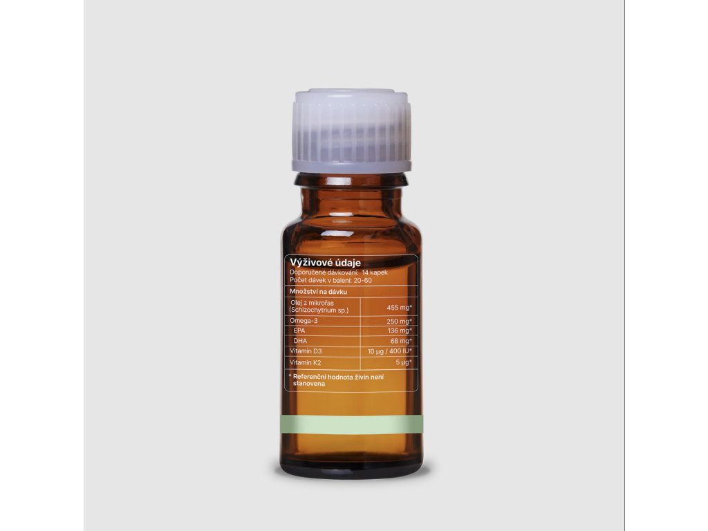 | Zloženie Detské Omega 3 + D3/K2 Neutrálne: | Olej z mikrorias (Schizochytrium sp.); bio kokosový MCT olej; menachinon-7; antioxidant: rozmarínový extrakt; cholekalciferol |