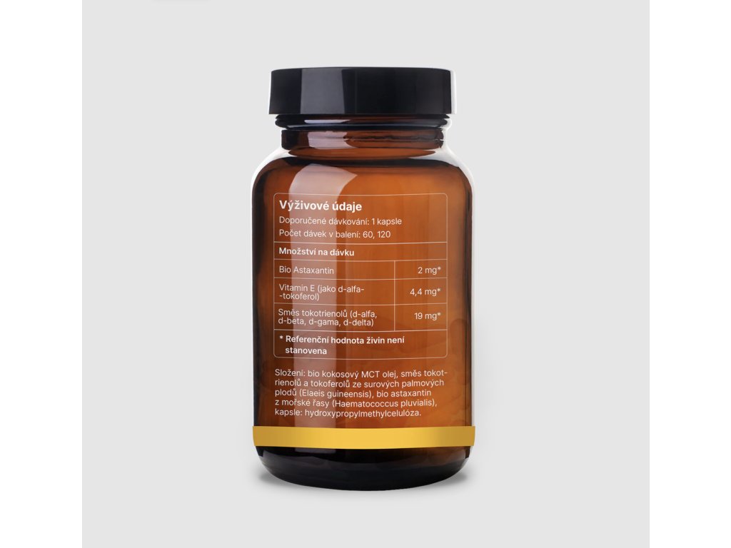 | Zloženie: | Bio kokosový MCT olej, zmes tokotrienolov a tokoferolov zo surových palmových plodov (Elaeis guineensis), bio astaxantín z morskej riasy (Haematococcus pluvialis), kapsuly: hydroxypropylmetylcelulóza |
