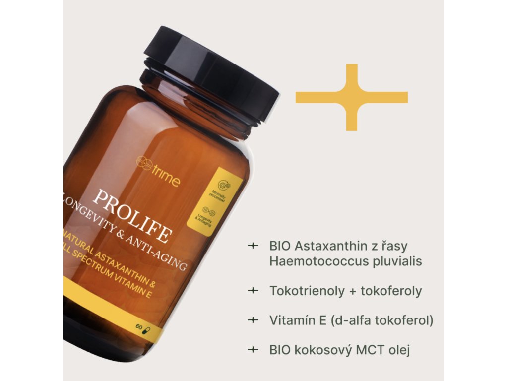 Prolife kombinuje širokospektrálny vitamín E s astaxantínom, ktorý je extrahovaný tou najšetrnejšou metódou bez použitia chemických rozpúšťadiel, čo zaisťuje maximálnu čistotu a kvalitu.