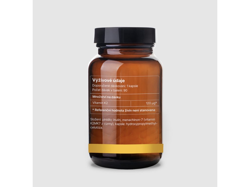 | Zloženie: | Plnivo: inulín, menachinón-7 (vitamín K2MK7 z cíceru), kapsula: hydroxypropylmetylcelulóza |